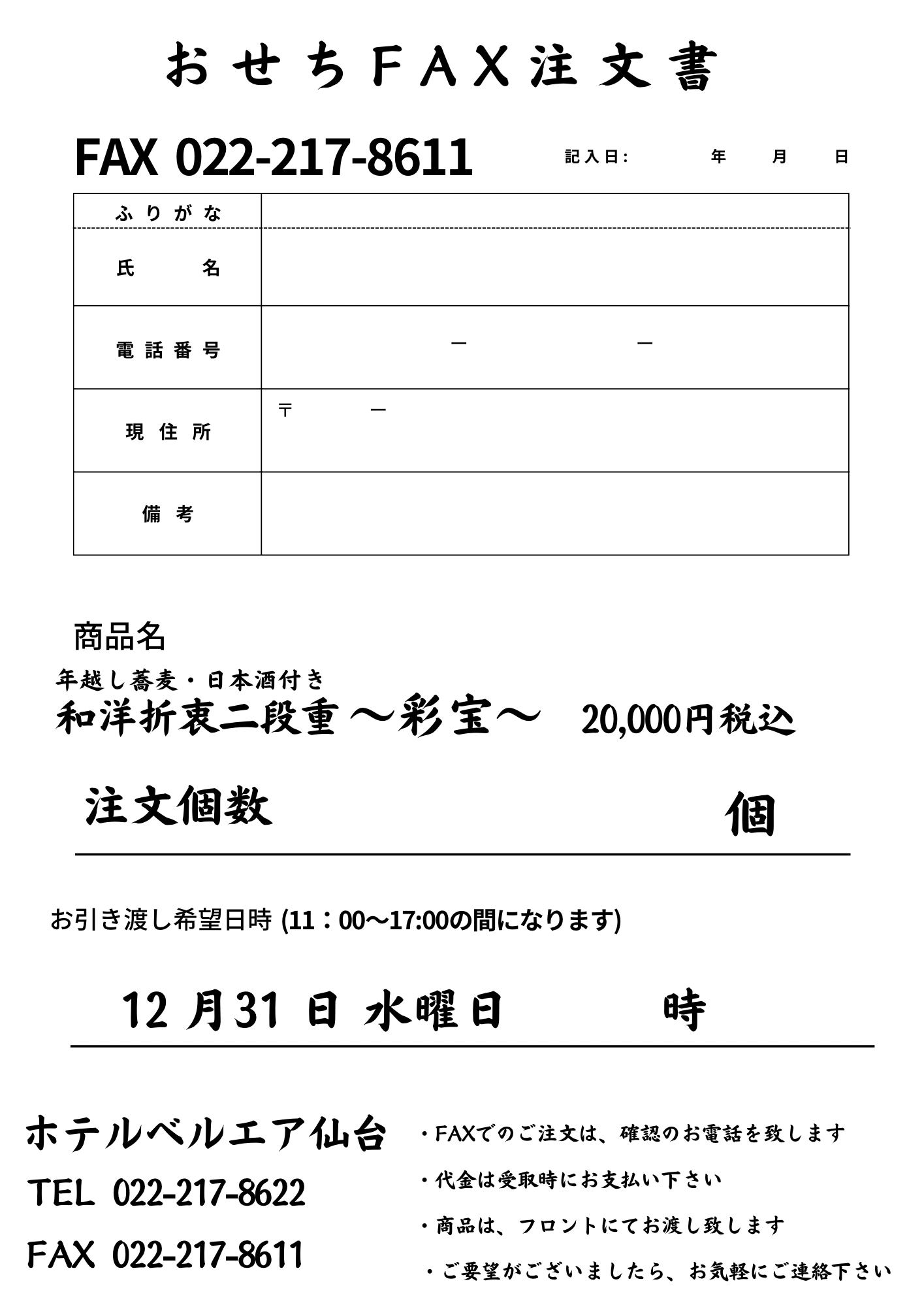 | お受け渡し場所 | ホテルベルエア仙台 |