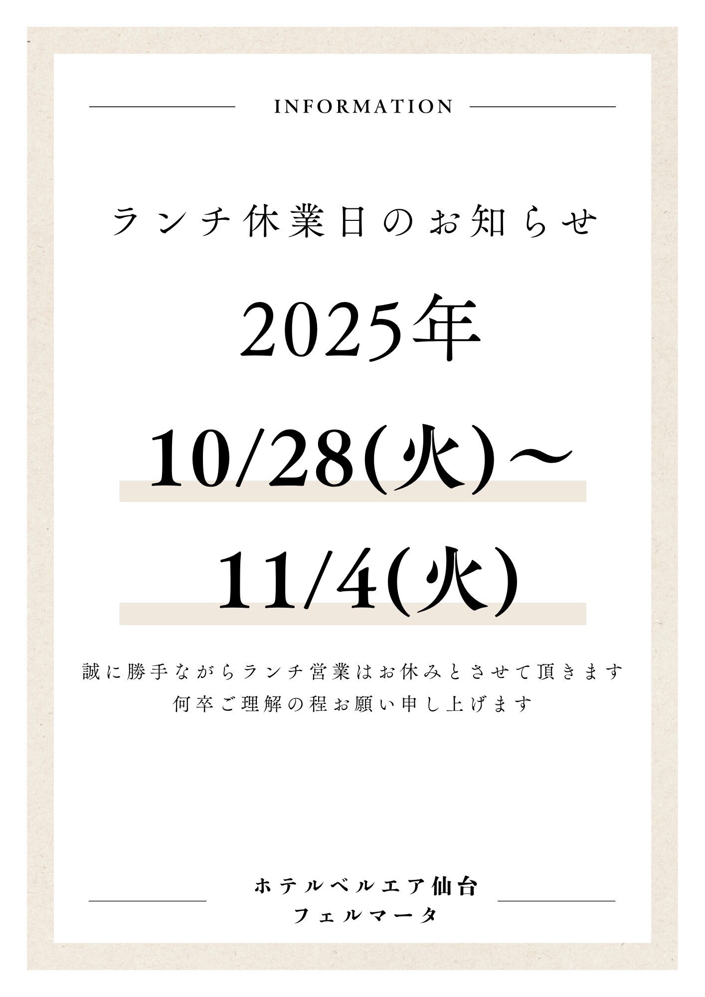 10月28日(火)~11月4日(火)ランチ営業休業のお知らせ
